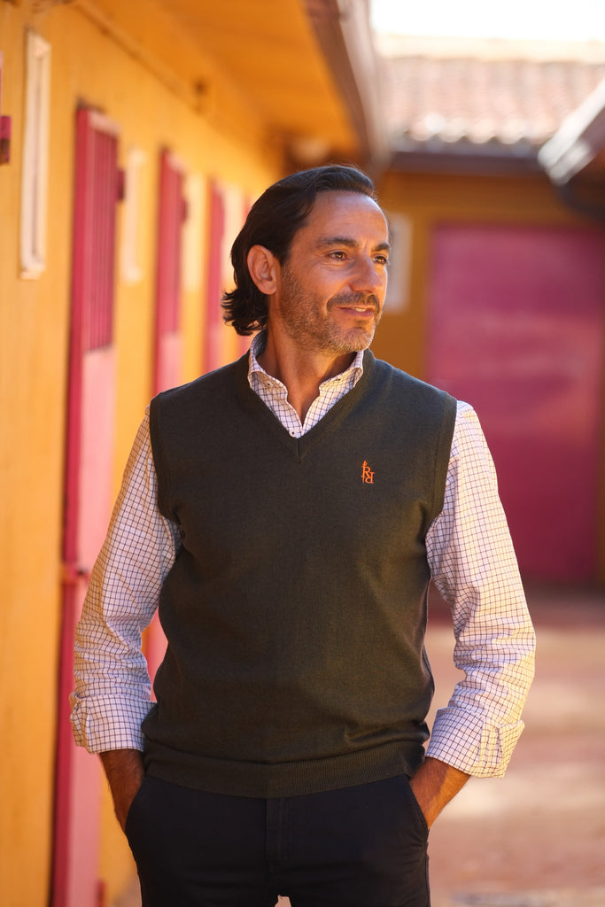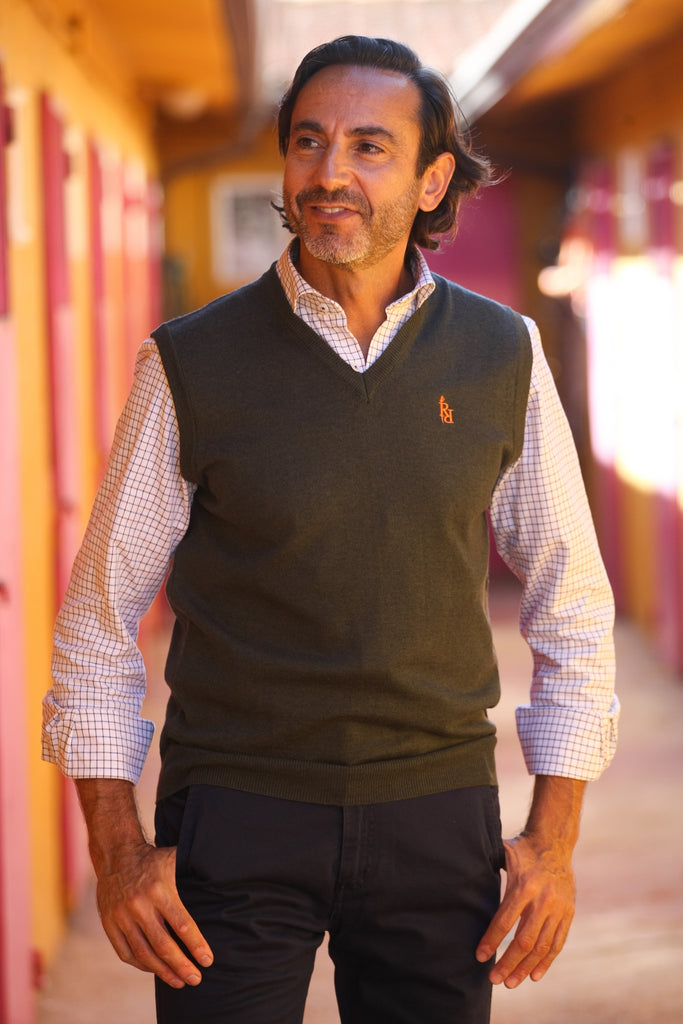 Chaleco hombre punto verde RqueR Con logo bordado en naranja.