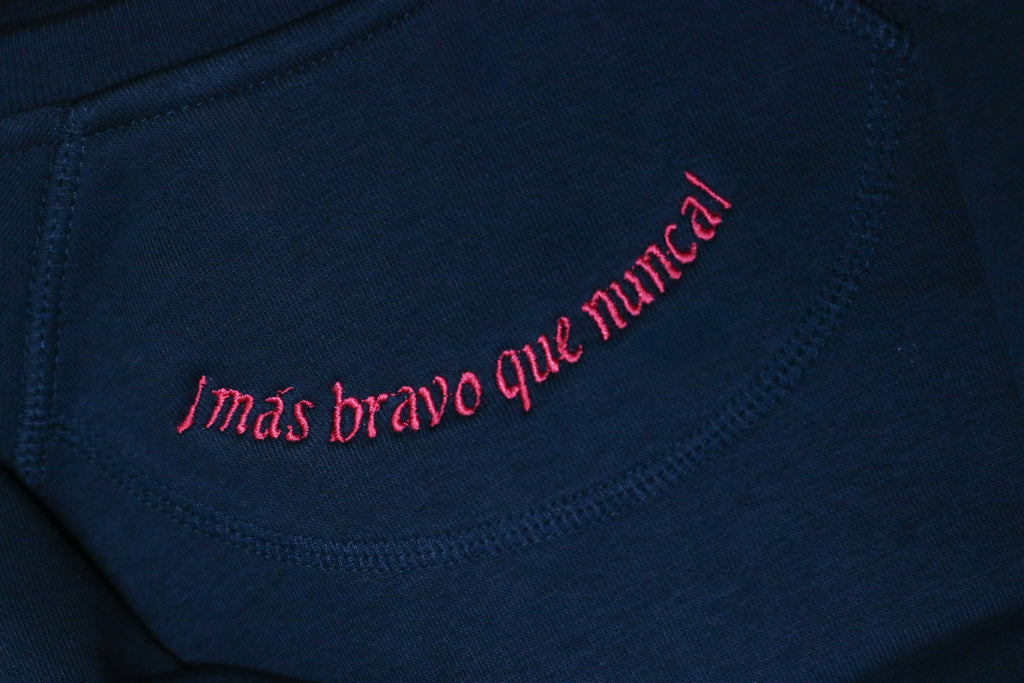 Sudadera azul marino de algodón orgánico cuello redondo RqueR. Logo y frase en la espalda “más bravo que nunca" en fucsia.